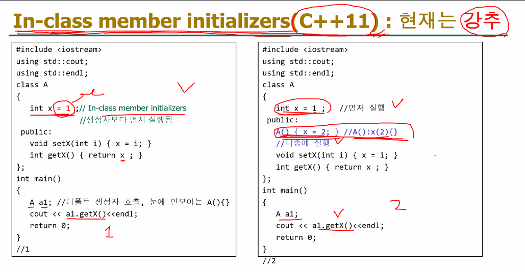 - 클래스 A의 멤버 변수 x가 선언될 때, = 1이라는 초기값이 직접 할당되어 있어요. 이걸 **"인클래스 멤버 초기화(In-class member initializer)"**라고 부른단다.