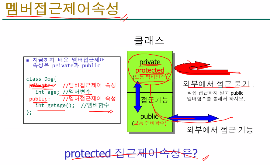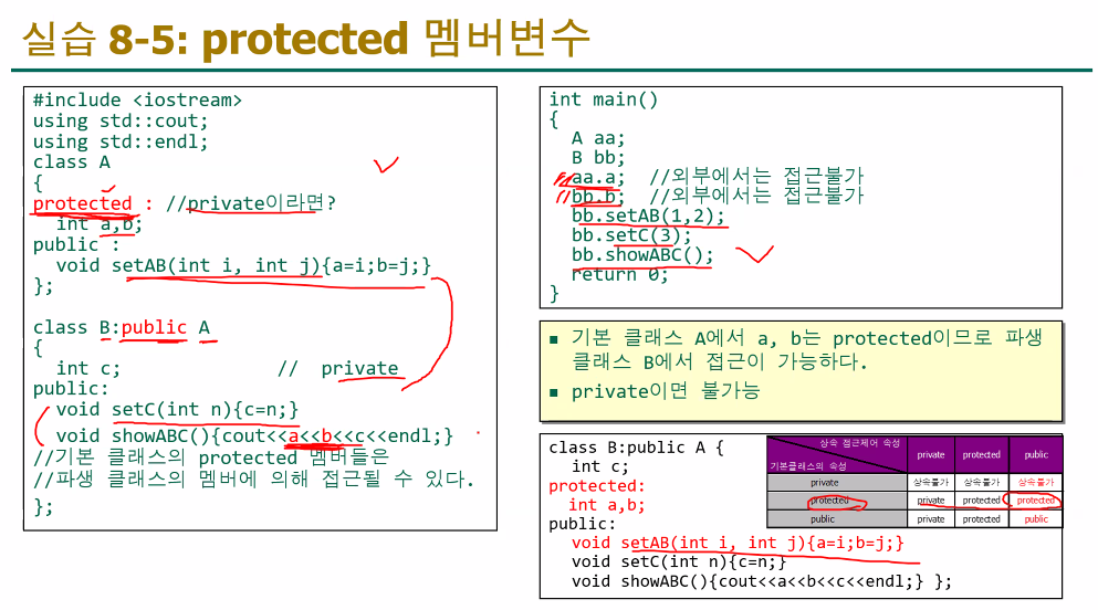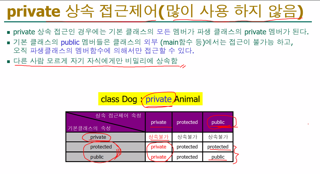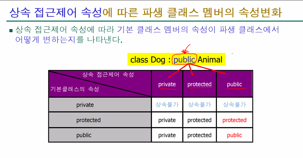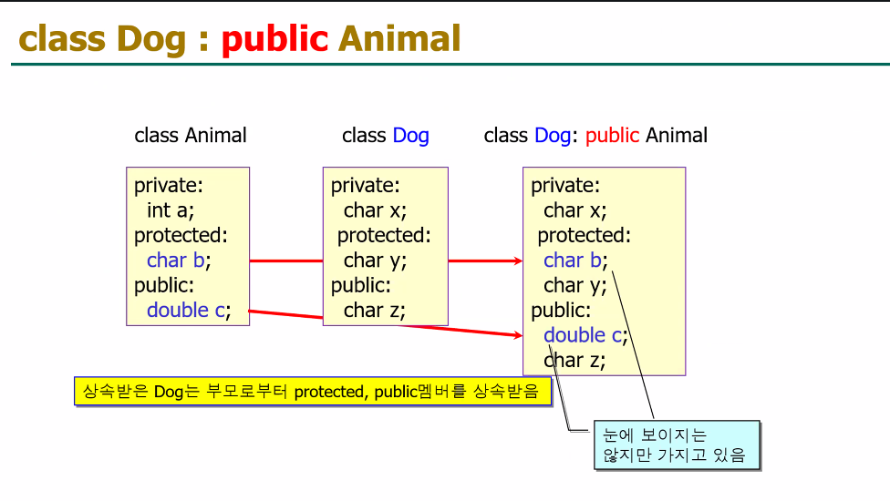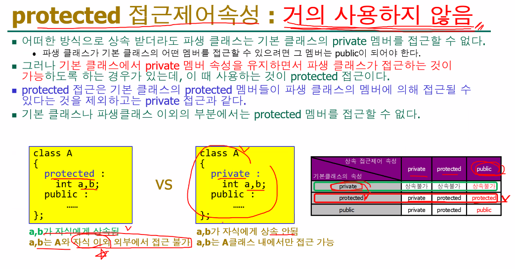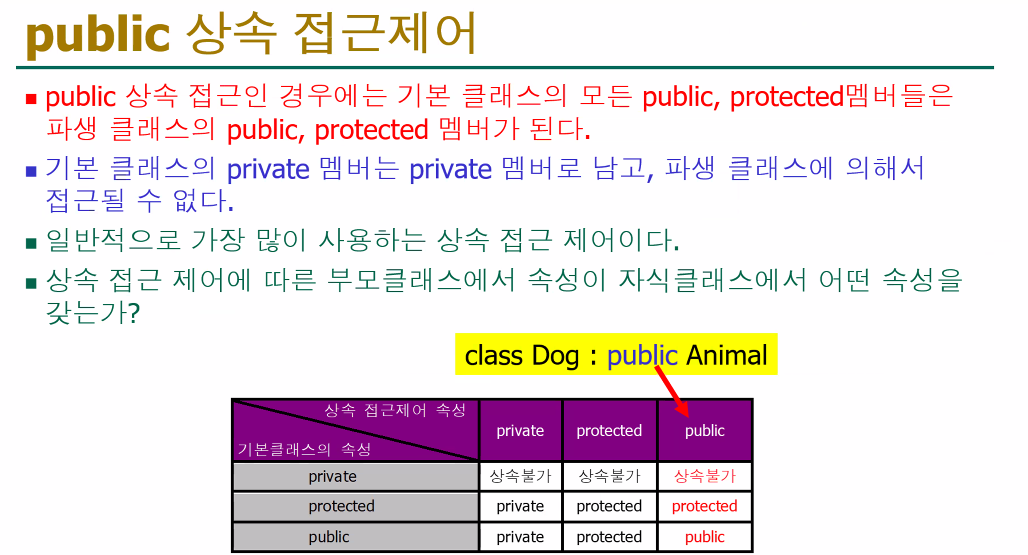 | 상속 후 | 파생 클래스에서 접근 불가. (상속은 되지만, 사용할 수 없음) | 파생 클래스에서 접근 가능. |