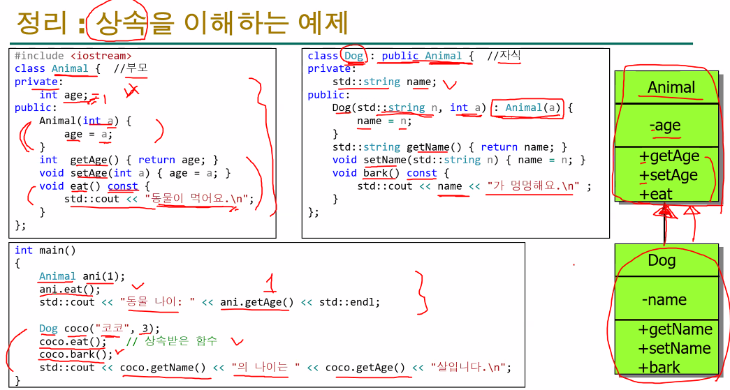 - std::cout << coco.getName() << "의 나이는 " << coco.getAge() << "살입니다.\n";: coco의 이름("코코")과 Animal로부터 상속받은 getAge() 메서드를 통해 나이(3)를 출력합니다.