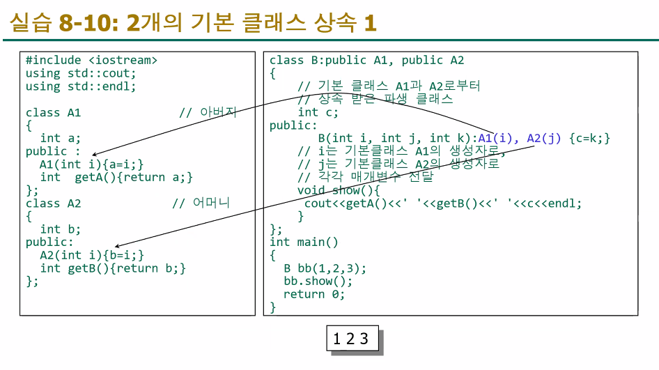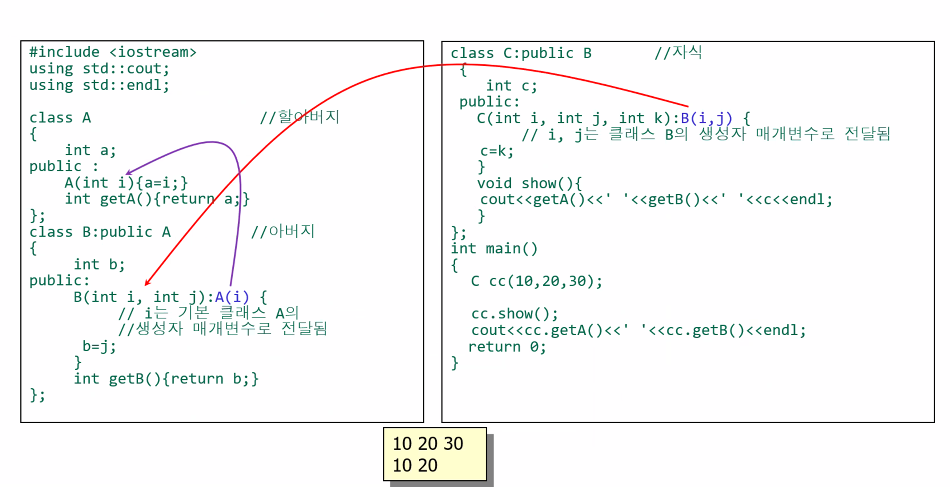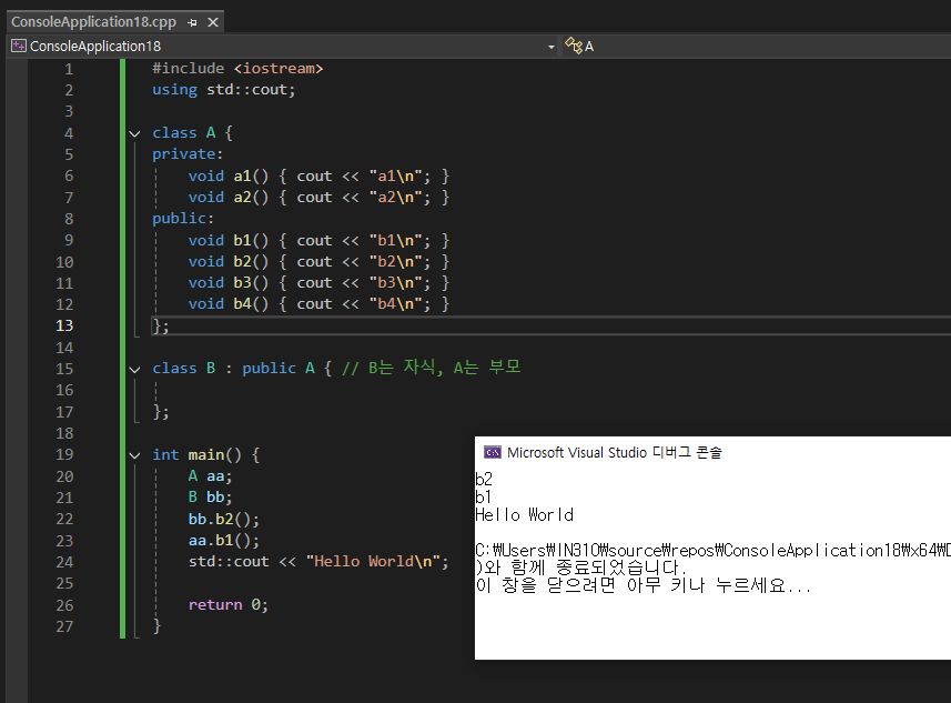 - class B : public A: class B를 정의합니다. 여기서 : public A는 B가 A를 공개적으로(public) 상속받는다는 것을 의미합니다.