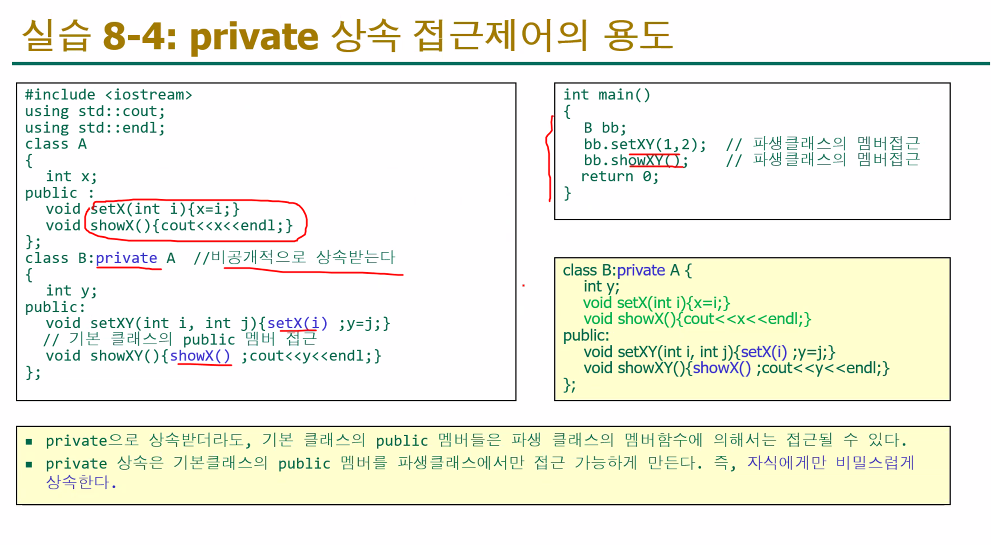 - 이것은 B가 A의 모든 public 및 protected 멤버를 자신의 멤버처럼 사용할 수 있게 됩니다.