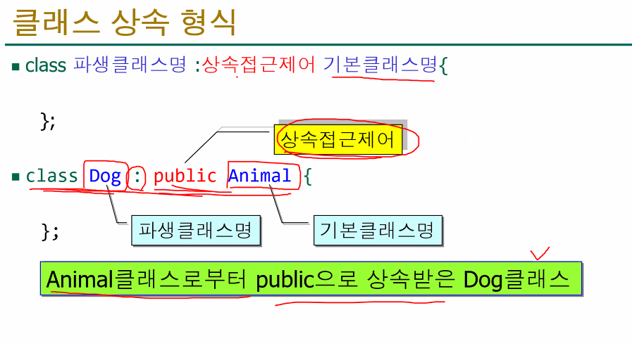- class Dog : public Animal (자식 클래스)