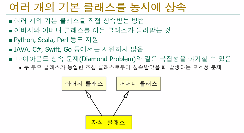 | Python | class Child(Parent) | 같은 이름으로 재정의 |